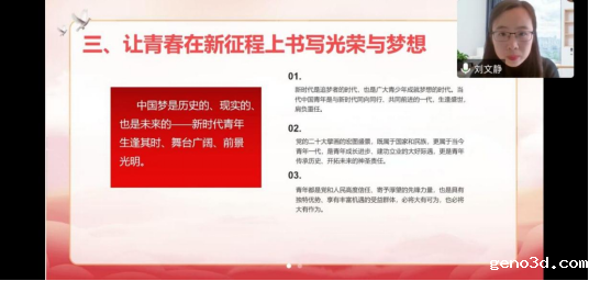 课程伊始,刘文静概述了本次培训要进一步加强青年学生骨干对党的二十大精神的深入理解,强化思想引领,以“让青春在新征程上书写光荣与梦想”为主题,从深刻理解大会主题、深刻理解党的二十大的重大意义、为什么重视青年工作这三个方面着手,带领同学们学习了党的二十大精神。她强调,当代青年人生奋斗的黄金期与全面建设社会主义现代化国家的宏伟征程高度契合,生逢伟大时代、肩负强国使命,广大青年应主动接过历史的接力棒,争做有理想、敢担当、能吃苦、肯奋斗的新时代好青年,用青春的能动力和创造力砥砺成长,用青年的智慧和汗水为国家的繁荣做出贡献。学员们紧跟老师思路并认真聆听记录,收获颇多。