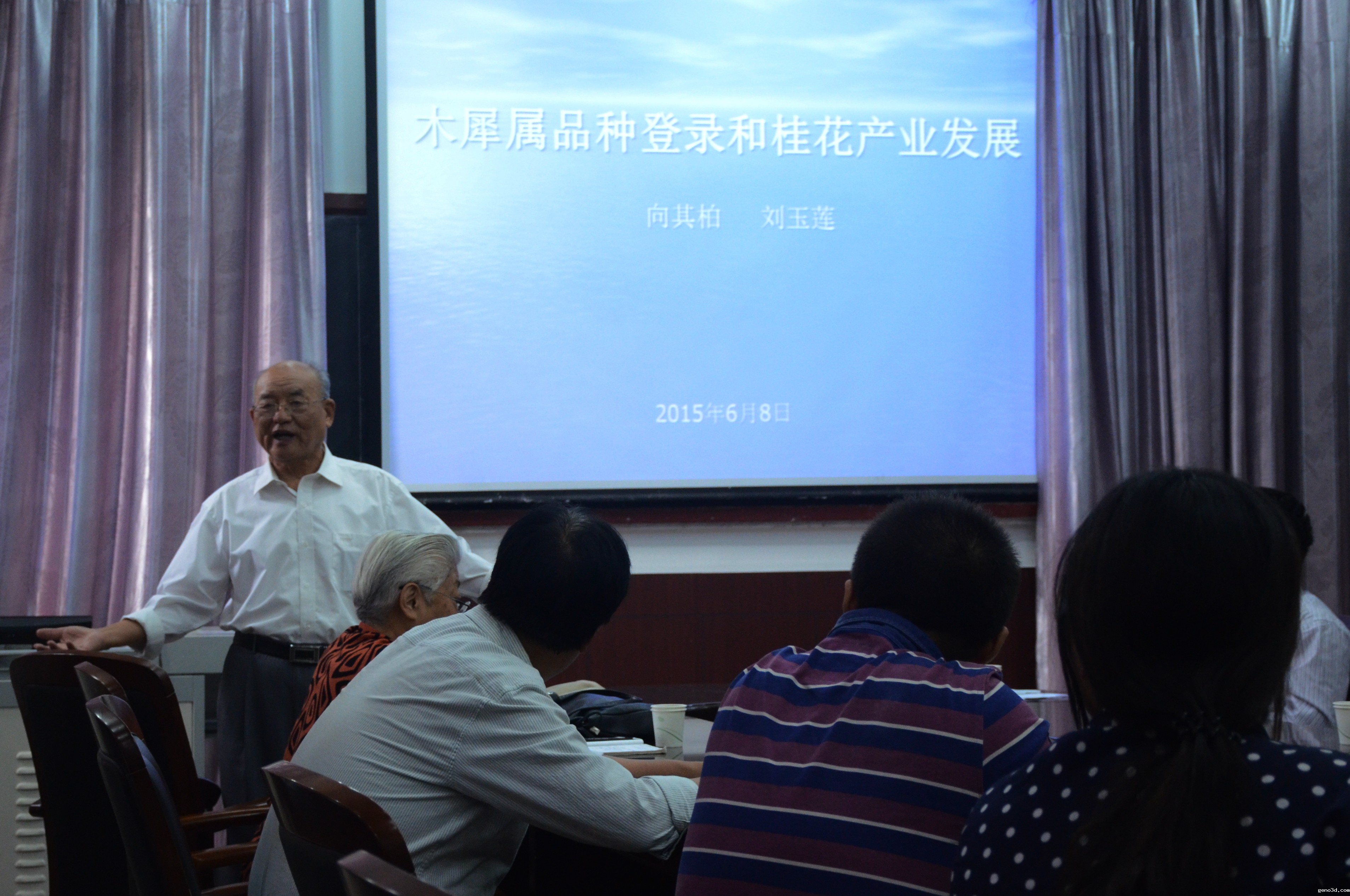 报告会开始,向其柏教授以幽默风趣的语言,结合自身科研经历,满怀激情地从植物命名讲起,延伸到植物品种命名的必要性及规范,又谈到国际栽培植物命名法规,对师生们平时植物学学习、研究方法提出了正确指导。进一步讲述了他在荣获木犀属植物栽培品种国际登录权威过程中经历的那些宝贵的点点滴滴。向教授最后对我国国内桂花产业现状及发展前景做了总体介绍和展望,向大家展示了我国在这方面已经取得的科研成果。