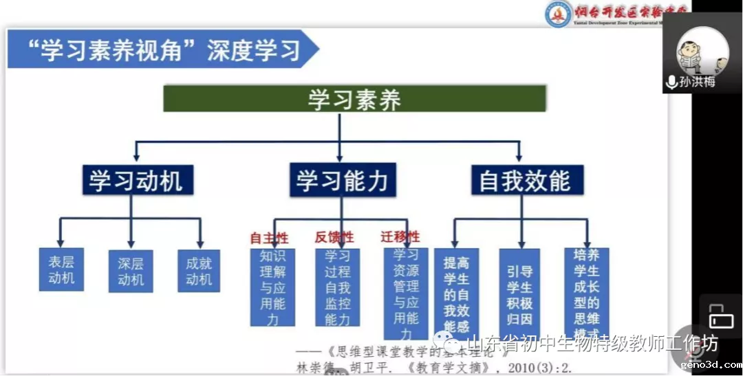 烟台市特级教师工作坊主持人孙洪梅介绍“双减背景下生物学教学中的深度学习”。孙老师通过对深度学习的概念、要求、内容等维度的介绍,使与会师生对深度学习在各视角的重要作用有了更加深刻的理解,通过介绍双减背景下深度学习的机遇与挑战,提出在生物学教学中开展深度学习的相关举措。